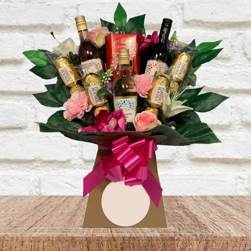 This beautiful hand made bouquet combines a selection of scrumptious Wines with delicious Ferrero Rocher and Lindor chocolates and silk flowers.