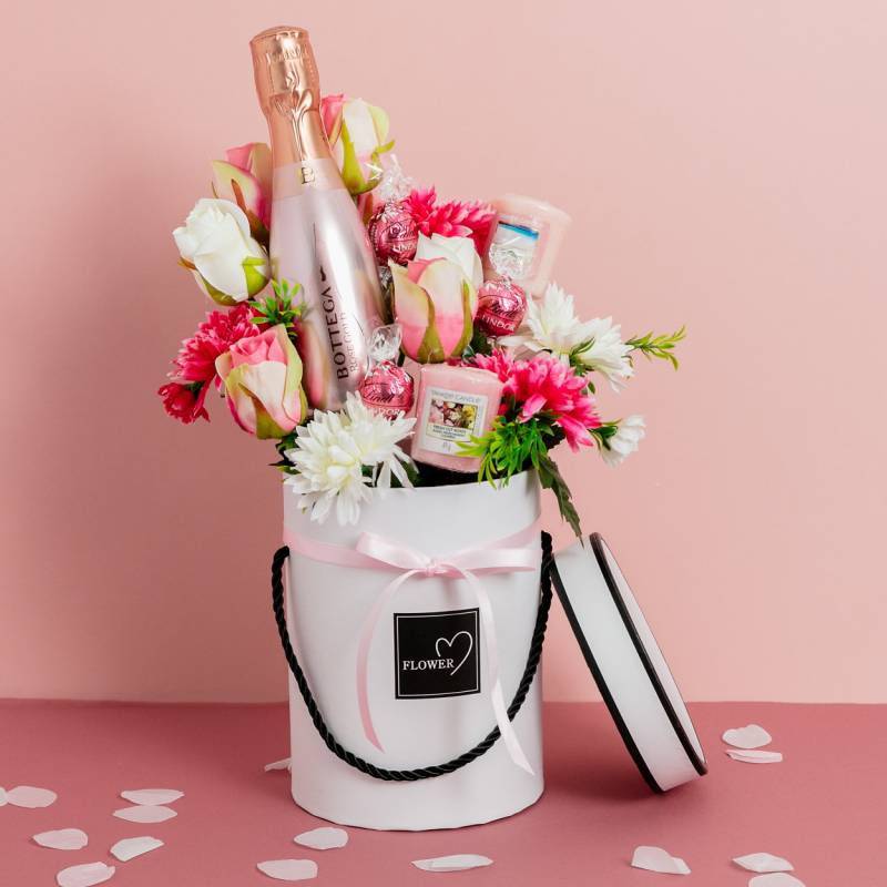Pink Prosecco, Yankee Candle and Lindor Hat Box Bouquet